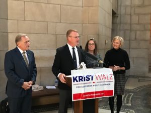 State Troopers Association of Nebraska President, Brian Petersen, announces the association’s endorsement of Democrat Bob Krist governor as Krist looks on.